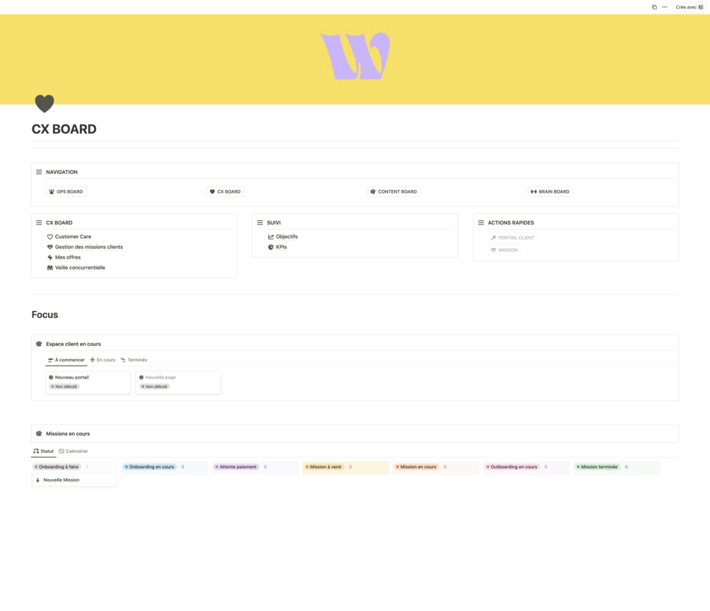 - CX BOARD : Gestion de l'expérience client. Ce tableau te permet de suivre les interactions avec tes clients et d'améliorer leur satisfaction.