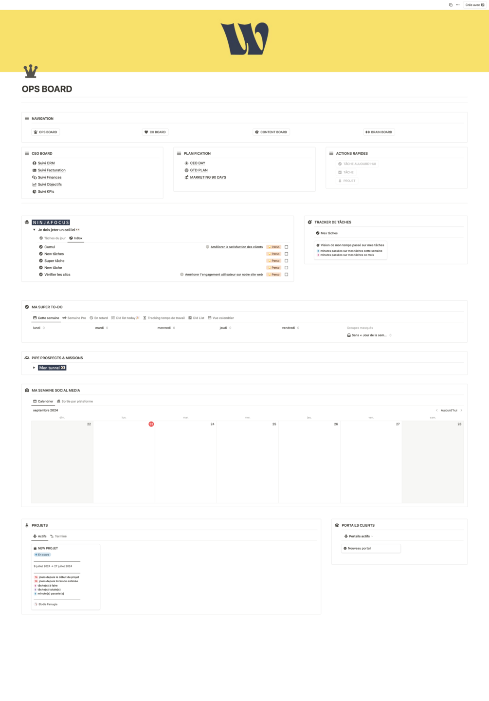 - OPS BOARD : Suivi opérationnel et gestion des performances. Ce tableau te permet de garder un œil sur l'avancement de tes opérations et d'évaluer les performances de ton entreprise.