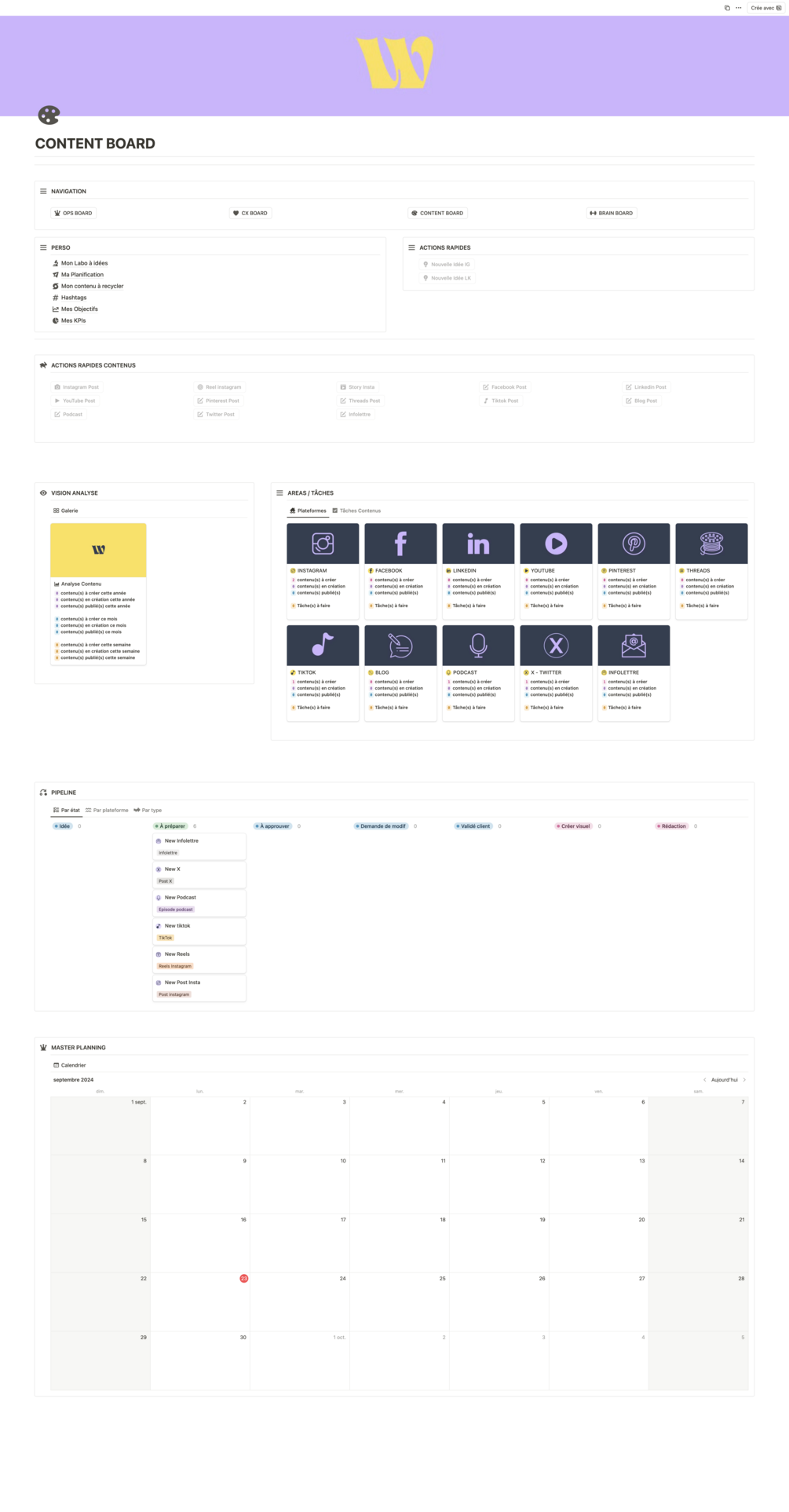 - Contenu : Organisation de tout ton contenu en cours et futur.